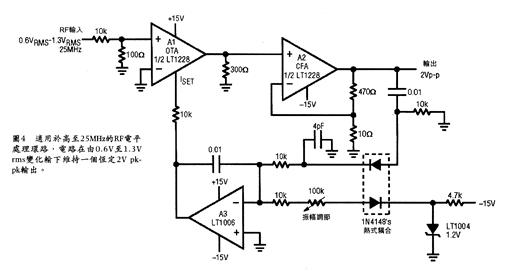 有关题目上有不少的应用注解供各位下载,也许以AN1762有很好的介绍,这包括有七个Pilips压扩器IC概览。各位可从Pilips 的网址(注2)下载AN1762的资料,档案名称为8020.pdf。 许多设计都依赖增益控制,使用互导放大器是可行的做法。本质上可以利用一个可变增益放大器,以其输出信号经过整流后得到之电压,控制其增益,便能做到自动增益或电平控制的效果。 二、自动电平控制 图4所示的基本自动电平控制电路,提供效能至10MHZ时可有20dB增益控制,加设一个输出驱动、半波整流器及增益控制缓冲器,即成为一个低成本的RF电平控制级,这个简单电路,特点是漂移低、失真低。可操作高至25MHZ,在以0.6V至1.3Vrms输入下,它产生恒定的2V pk-pk输出。至于更高的频率,还有不少专门的可变增益放大器,有两个引起我的注意是TL026(注3)及CLC520R(注4),提供有大的AGC范围、阔频宽及低相移,以及加上有容易控制的增益。